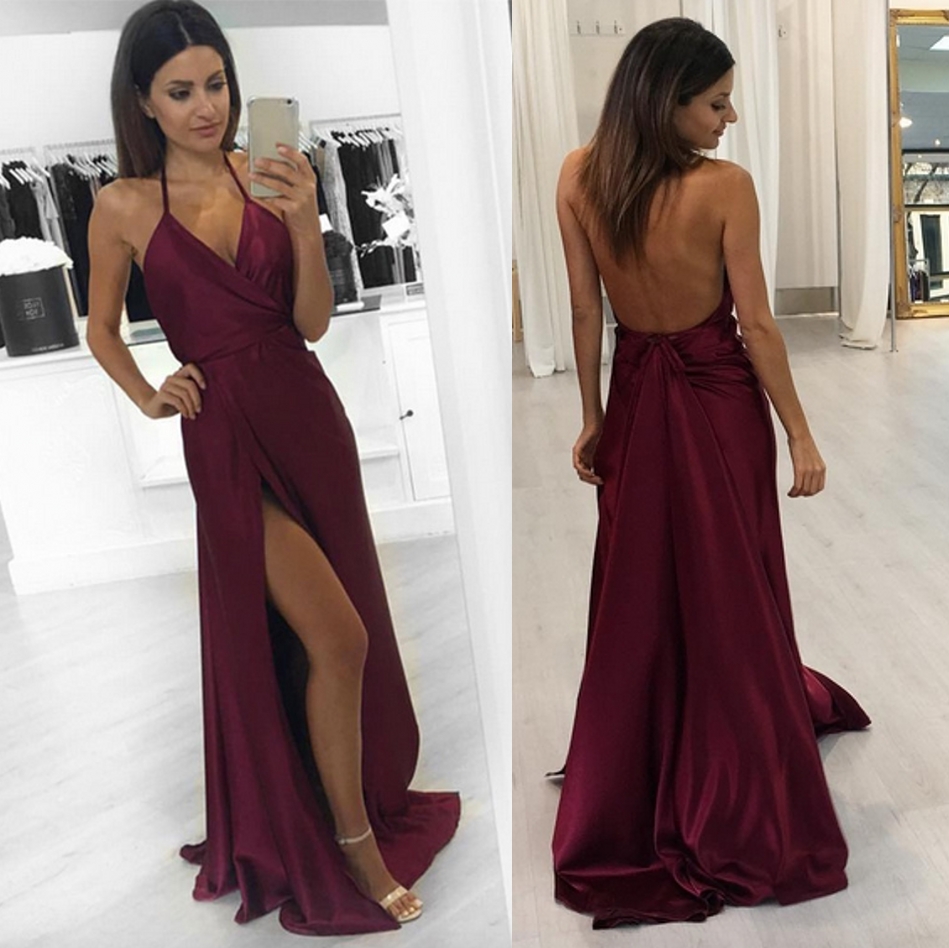 Sexy Burgundy simple prom dress, Halter Slit Evening Dresses, Sleeveless V-neck prom dresses