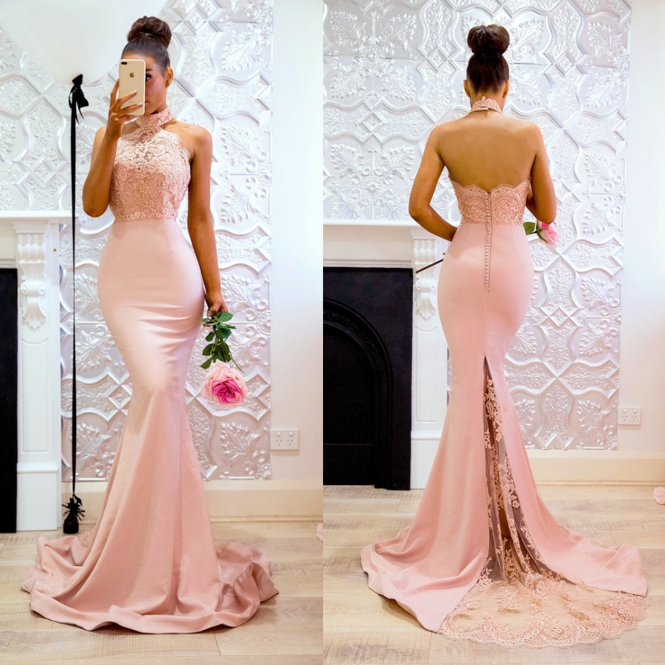 Pink Evening Dresses,High Neck Lace Prom Dress,Mermaid Evening Dress