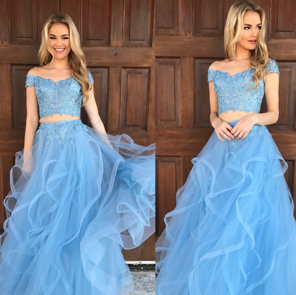 Floor-length Off-shoulder V-neck Tulle Two-piece Prom Dresses