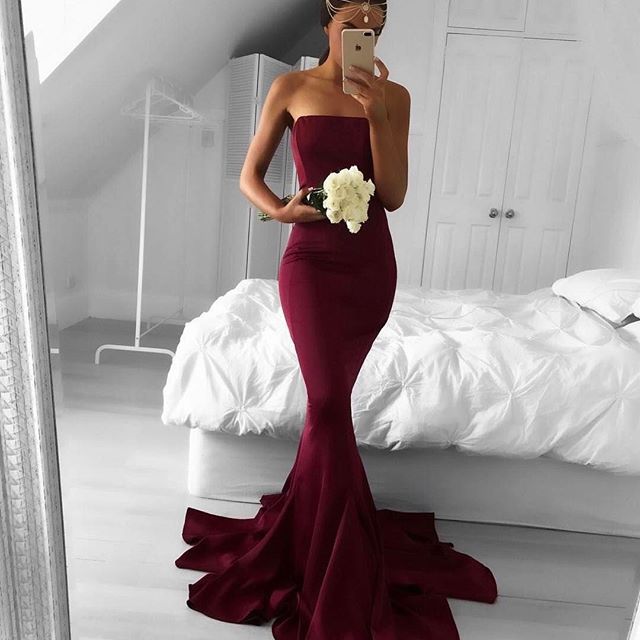 Burgundy Evening Dress,Strapless Mermaid Prom Dress,Sleeveless Evening Dress