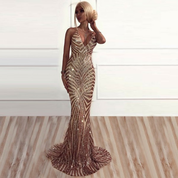 Sexy Sequined Prom Dresses | V-Neck Mermaid Crisscross Back Evening Gowns