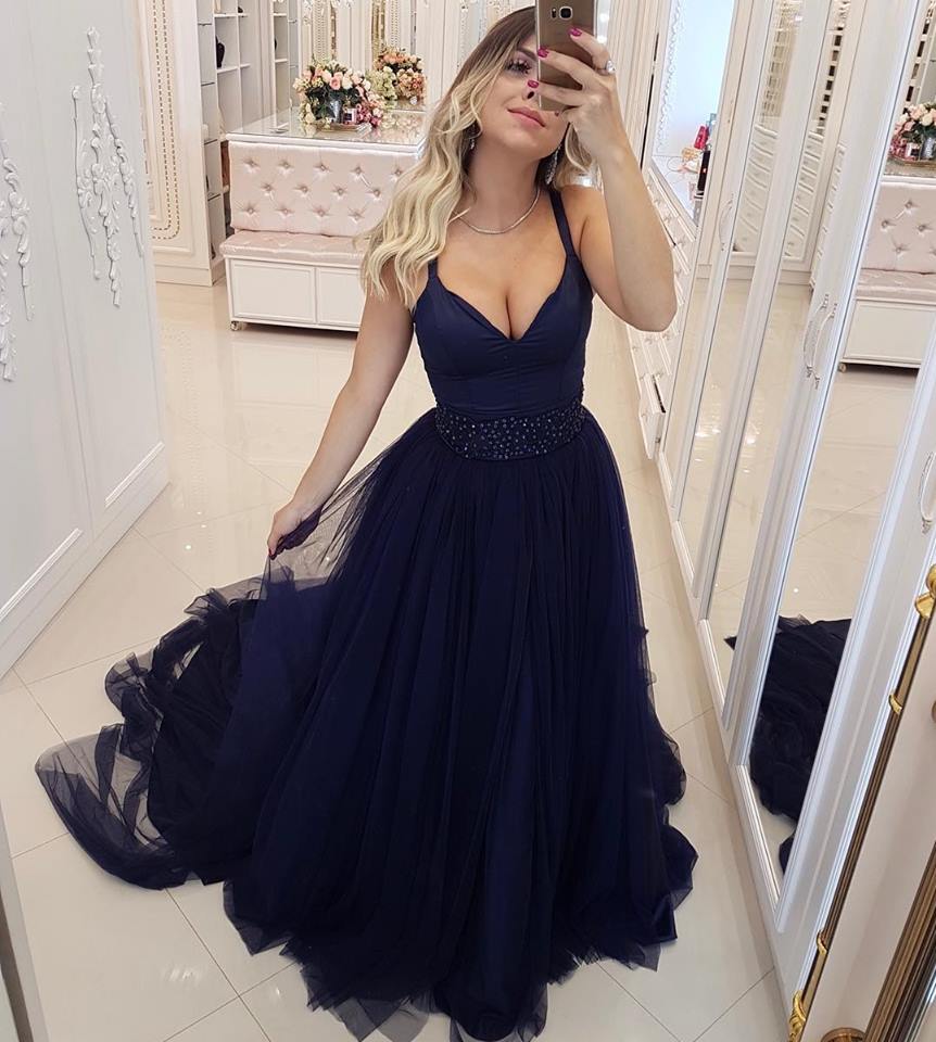 Sexy A-Line Dark Navy Spaghetti Straps Evening Dresses
