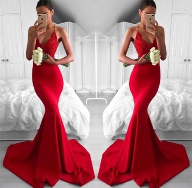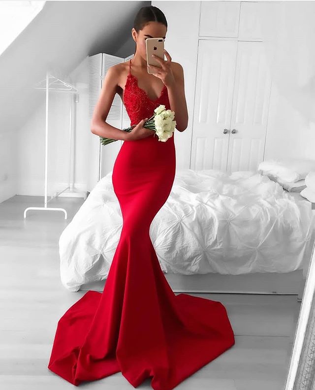 Sexy Red Mermaid Evening Gowns | Spaghettis Straps V-Neck Prom Dresses