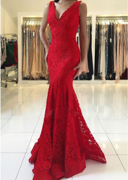 Red Sexy Mermaid Lace Prom Dresses | V-Neck Sleeveless Cheap Evening Dresses