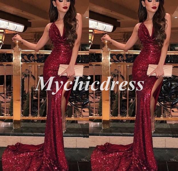 Sexy Sequins Burgundy Prom Dresses | V-Neck Sleeveless Side Slit Evening Dresses