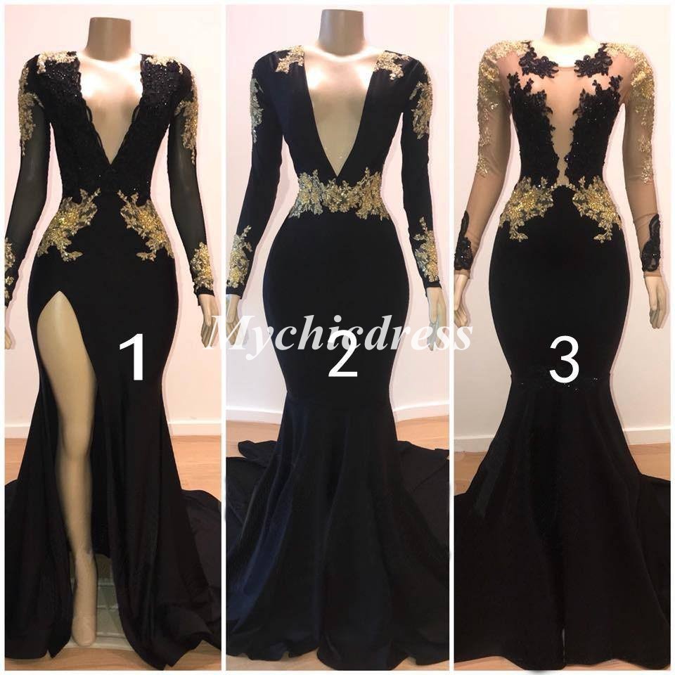 Sexy Black Gold Prom Dresses Long Sleeve Appliques Evening Gowns On Sale