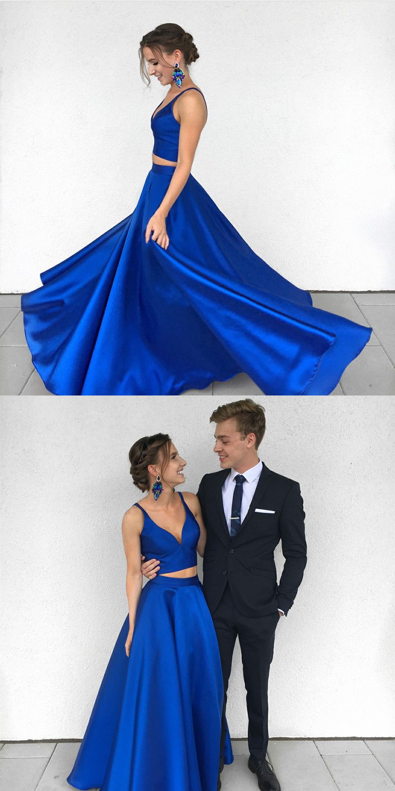 2 Piece royal Blue Prom Dresses satin Evening Dresses