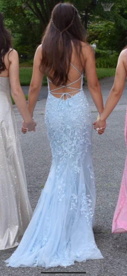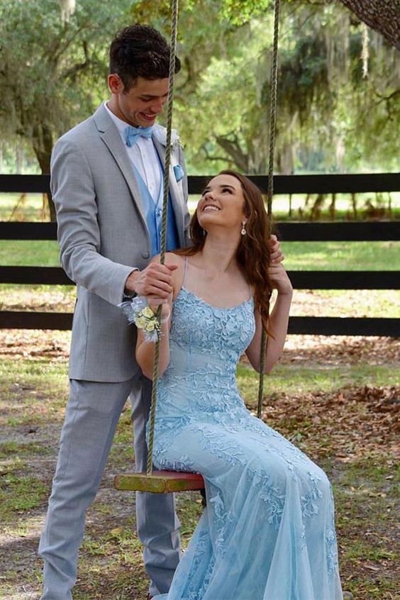 Mermaid Spaghetti Straps Mermaid Lace Light Blue Prom Dresses