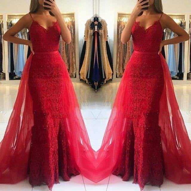 Mermaid Lace Red Prom Dresses Spaghetti Straps with Detachable Train