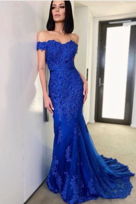 Off the Shoulder Lace Beaded Mermaid Blue Prom Dresses