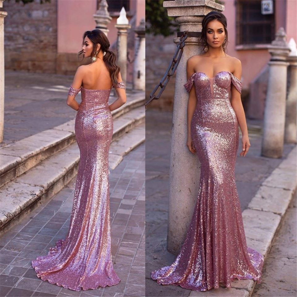 Off the Shoulder Pink Sequin Prom Dresses Long Sweetheart Evening Gown
