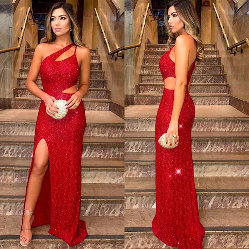 Sexy Mermaid Sleeveless Red Sequined Prom Dresses Side Split