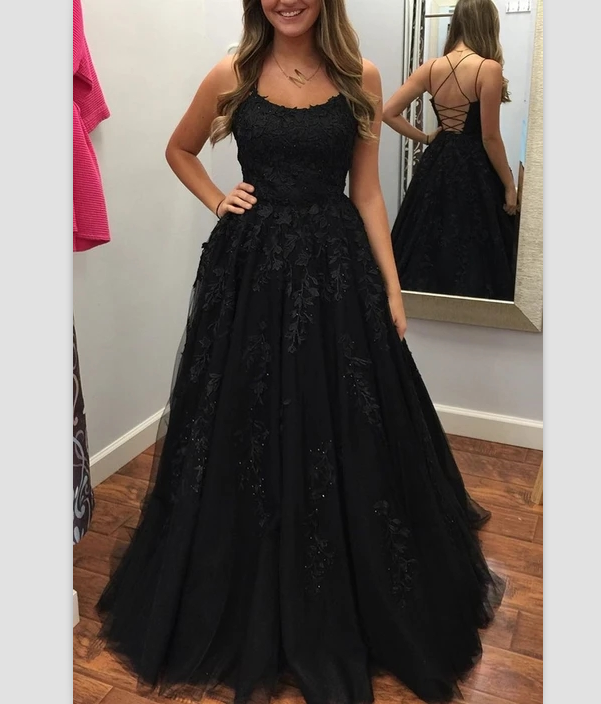 A Line Long Lace Appliques Black Prom Dresses Sleeveless