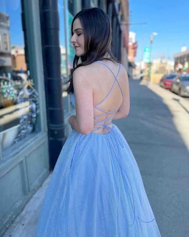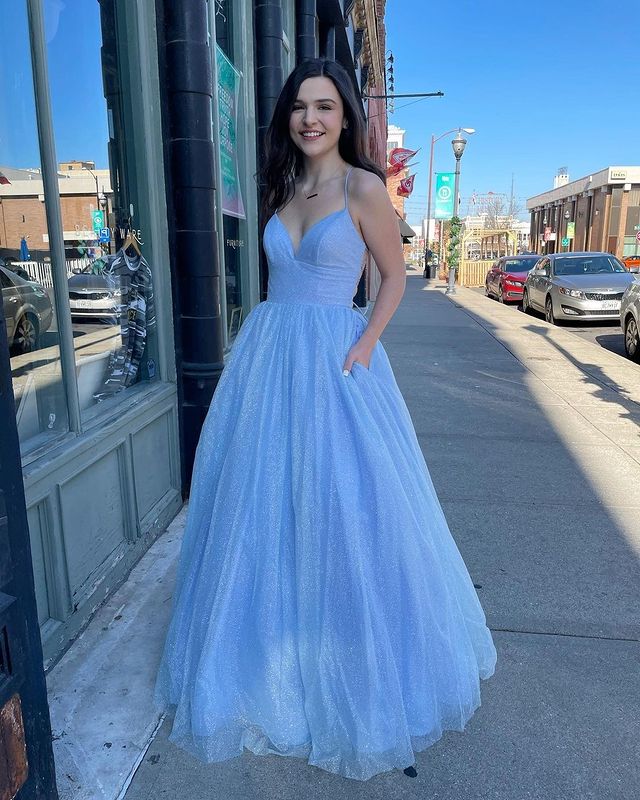 A Line Spaghetti Straps V Neck Blue Sequin Prom Dresses