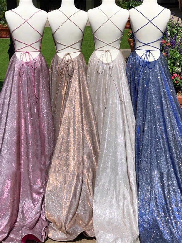 Blue Sequin Prom Dresses Split Evening Dress with Pockets