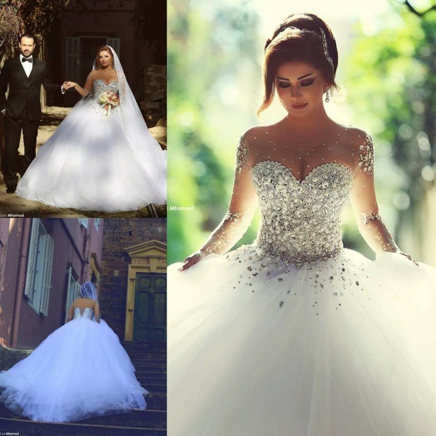 Free Wedding Veil,Crystals Ball Gown Wedding Dress,Long Sleeves Princess Bridal Gown