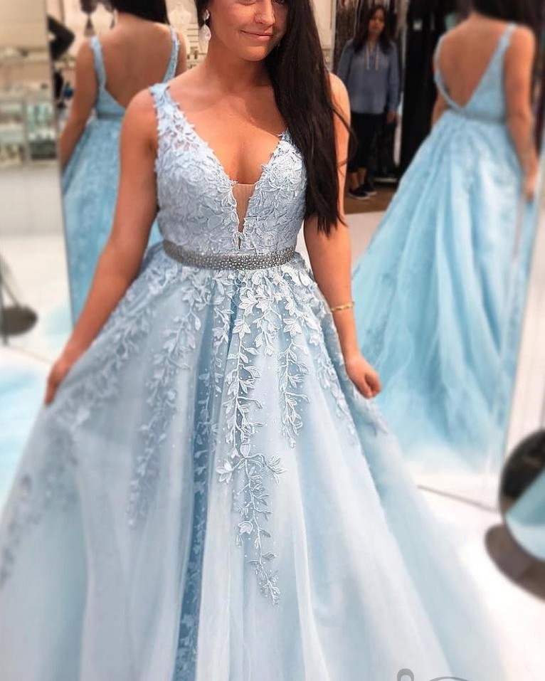 Lace Blue Prom Dresses Beaded Long Strapless Evening Gowns