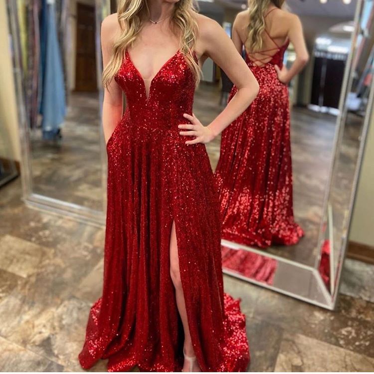 V Neck Red Sequin Prom Dresses Sheath Sleeveless Evening Gown