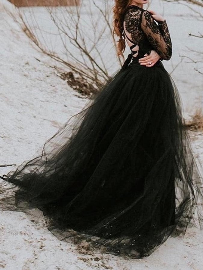 A Line Long Sleeves Tulle Lace Black Boho Wedding Dresses