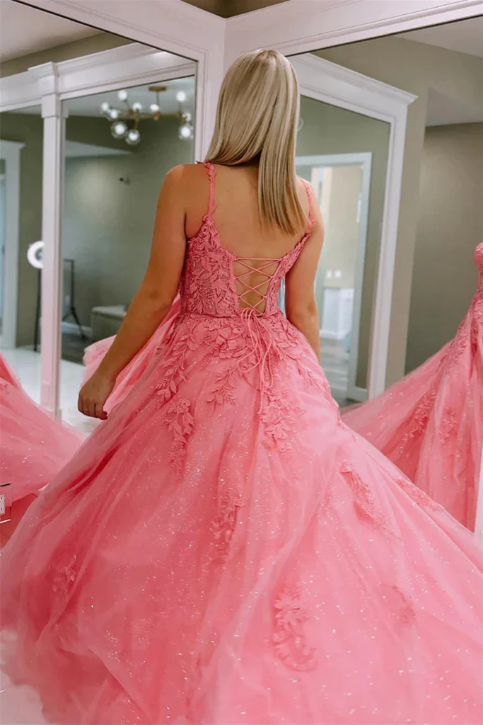 2024 Princess Pink Lace Prom Dress Long A Line Formal Gown