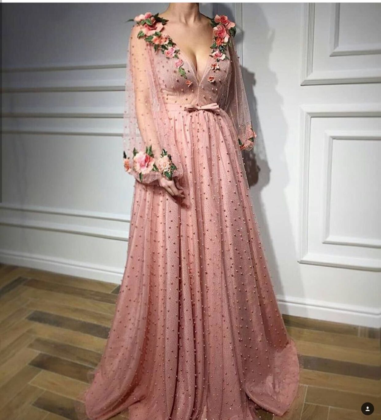 Sexy Sheer Long Sleeves Flower V Neck Evening Dress