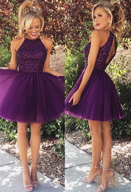 Elegant Purple Beadings Halter Homecoming Dress Short