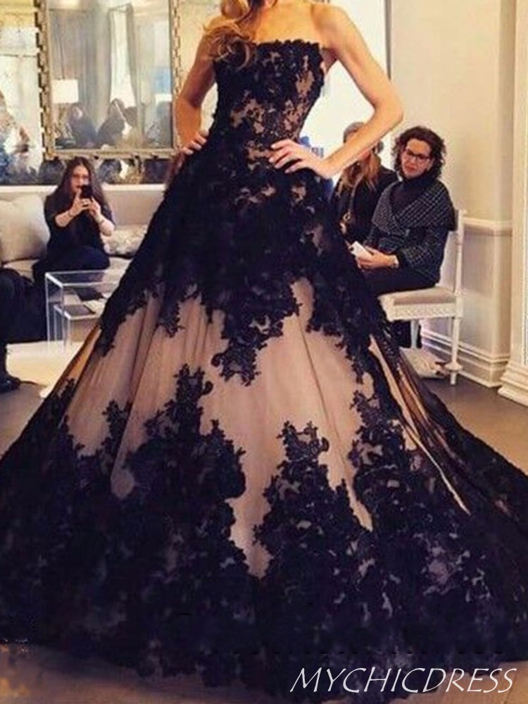 Ball-Gown Strapless Lace Sleeveless Black Weddng Dresses