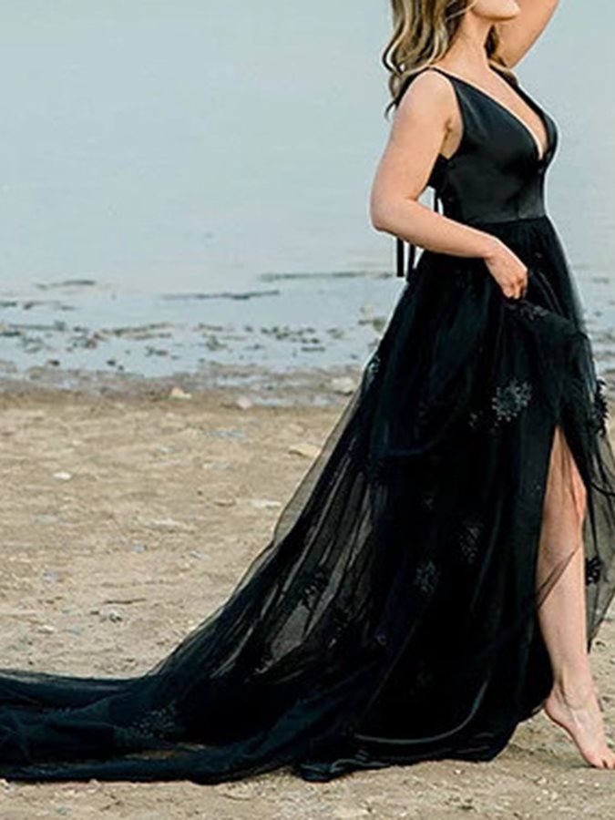 Sheath Sleeveless Black Tulle Lace Beach Wedding Dresses
