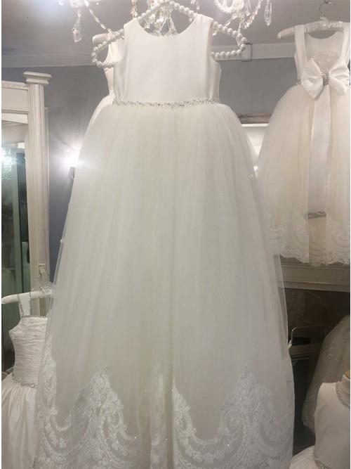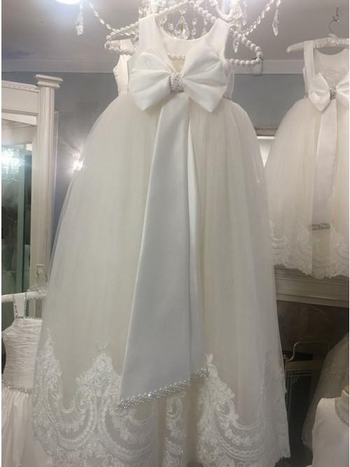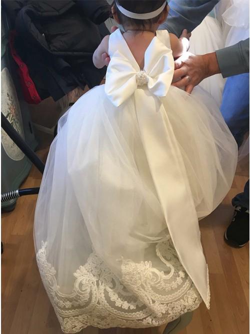 Sweet Sleeveless Lace Flower Girl Dress with Bowknot Sweep Train