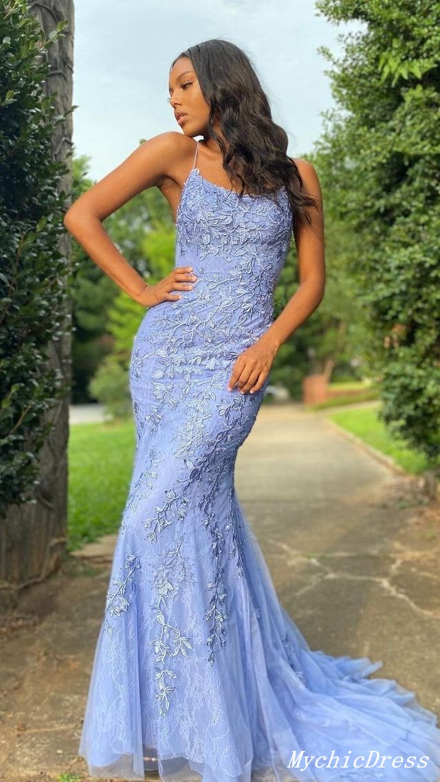 Long Blue Lace Prom Dresses Mermaid Cross Back Evening Gown