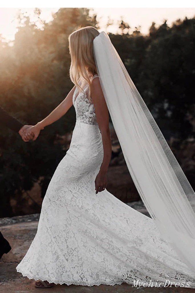 Ivory Lace Boho Wedding Dresses V Neck Mermaid Country Wedding Dresses