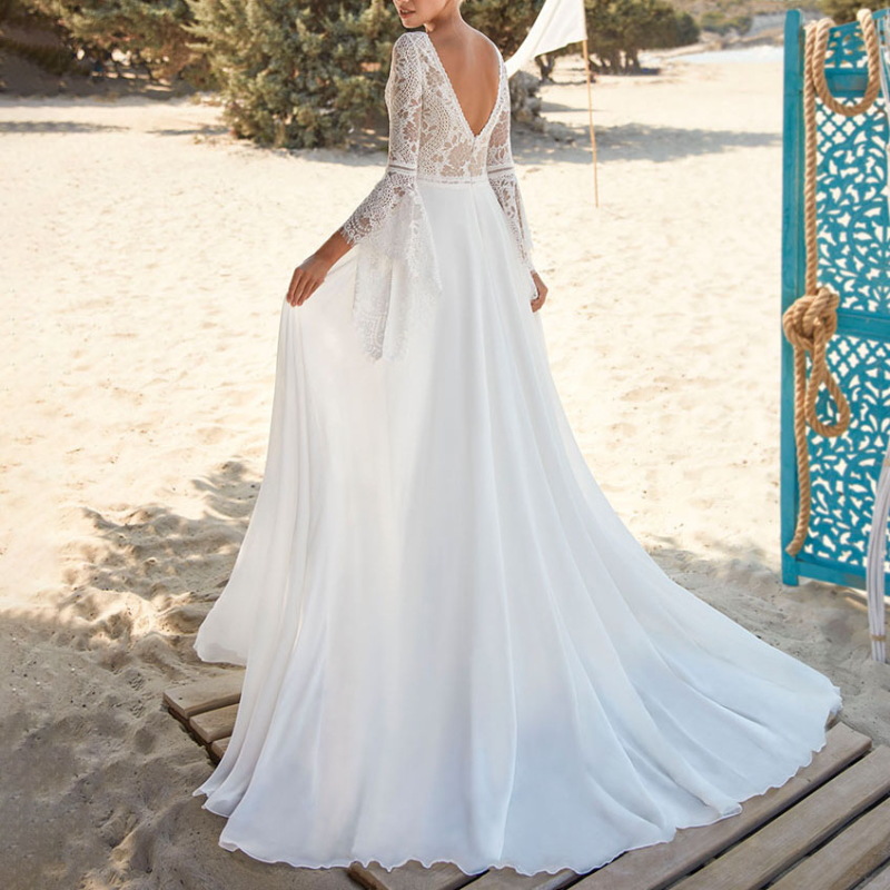 Long Sleeves Lace Chiffon Beach Wedding Dresses